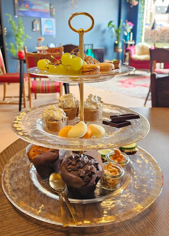3-lags: Vælg 4 kopper te eller 2 kopper kaffe/sodavand, mini-hapsere, surdejsbrød m. hønsesalat, 2 muffins, cookies, chokolade, nødder og druer.